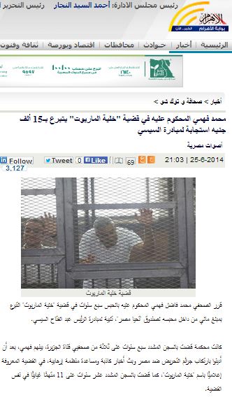 قرر الصحفي محمد فاضل فهمي الذي يعمل بقناة الجزيرة والمحكوم عليه بالحبس سبع سنوات في قضية "خلية الماريوت" المعتقل فيها عدد كبير من العاملين بقناة الجزيرة التبرع بمبلغ مالي من داخل محبسه لصندوق "تحيا مصر"، تنفيذا لطلب عبد الفتاح السيسي وتأكيدا على انه مؤيد للانقلاب بحسب جريدة الاهرام .