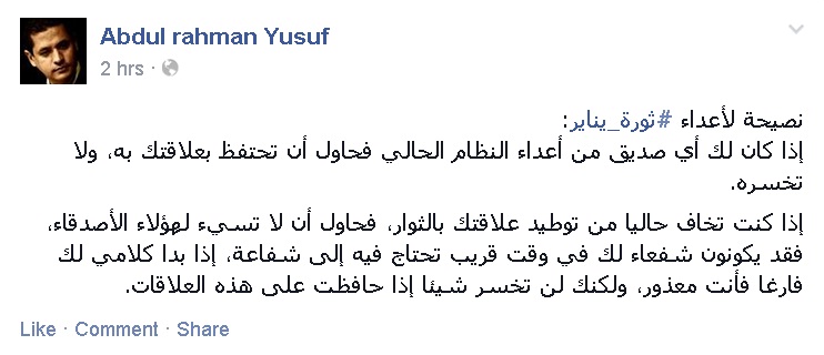 وقال يوسف فى تدوينة عبر صفحته على "فيس بوك": نصيحة لأعداء ثورة يناير: إذا كان لك أي صديق من أعداء النظام الحالي فحاول أن تحتفظ بعلاقتك به، ولا تخسره".