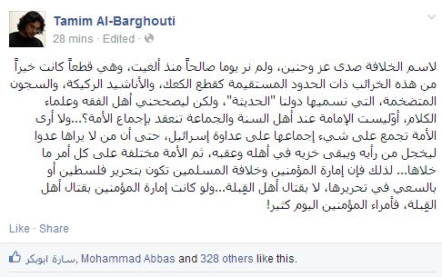 وقال البرغوثي:"لاسم الخلافة صدى عز وحنين، ولم نر يوما صالحاً منذ ألغيت، وهي قطعاً كانت خيراً من هذه الخرائب ذات الحدود المستقيمة كقطع الكعك، والأناشيد الركيكة، والسجون المتضخمة، التي نسميها دولنا "الحديثة"، ولكن ليصححني أهل الفقه وعلماء الكلام، أوَليست الإمامة عند أهل السنة والجماعة تنعقد بإجماع الأمة".