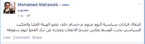 وقال محسوب فى تدوينة عبر موقع التواصل الاجتماعي "فيس بوك": "اعتقال قيادات سياسية اليوم منهم م.حسام خلف عضو الهيئة العليا والمكتب السياسي بحزب الوسط يعكس تشنج الانقلاب وعجزه عن ترك القمع ليوم سقوطه".
