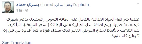 وقال حماد فى تدوينة عبر صفحته على "فيس بوك" :"عندما يتم إلغاء المواد الغذائية بالكامل على بطاقة التموين وتستبدل بدعم شهري قيمته ١٥ جنيها، ويتم إضافة سلع إجبارية على البطاقة (بسعر السوق).