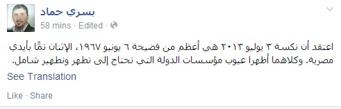 وقال حماد في تدوينة عبر موقع التواصل الاجتماعي "فيس بوك": أعتقد أن نكسة ٣ يوليو ٢٠١٣ هي أعظم من فضيحة ٦ يونيو ١٩٦٧، الإثنان تمَّا بأيدي مصرية. وكلاهما أظهرا عيوب مؤسسات الدولة، التي تحتاج إلى تطهر وتطهير شامل".