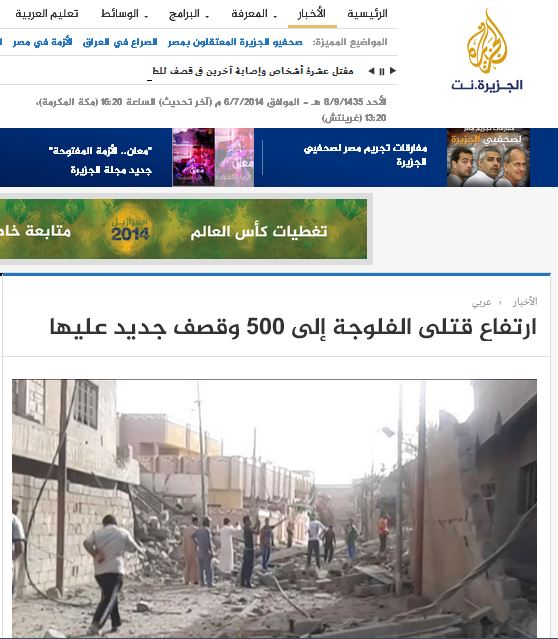 تعرضت مدينة "الفلوجة" بمحافظة "الأنبار" غربي "العراق" ، اليوم الأحد، لقصف مدفعي وصاروخي مكثف من قبل قوات الجيش العراقي، ذو الاغلبية الشيعية والمتمركز عند الأطراف الشرقية للمدينة، فضلاً عن غارات جوية، مما رفع عدد الضحايا في المدينة وحدها إلى أكثر من خمسمائة قتيل وأكثر من ألف جريح، في العمليات العسكرية التي تقوم بها قوات "المالكي" بمعاونة المستشارين الأمريكيين لاستعادة المدينة من قبضة ثوار العشائر بحسب قناة الجزيرة.