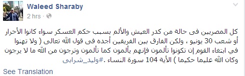 وأضاف شرابى فى تدوينة عبر صفحته الرسمية على موقع التواصل الاجتماعي"فيس بوك": "الفارق بين الفريقين أجده فى قول الله تعالى ( ولا تهنوا في ابتغاء القوم إن تكونوا تألمون فإنهم يألمون كما تألمون وترجون من الله ما لا يرجون وكان الله عليما حكيما )" الآية 104 سورة النساء .