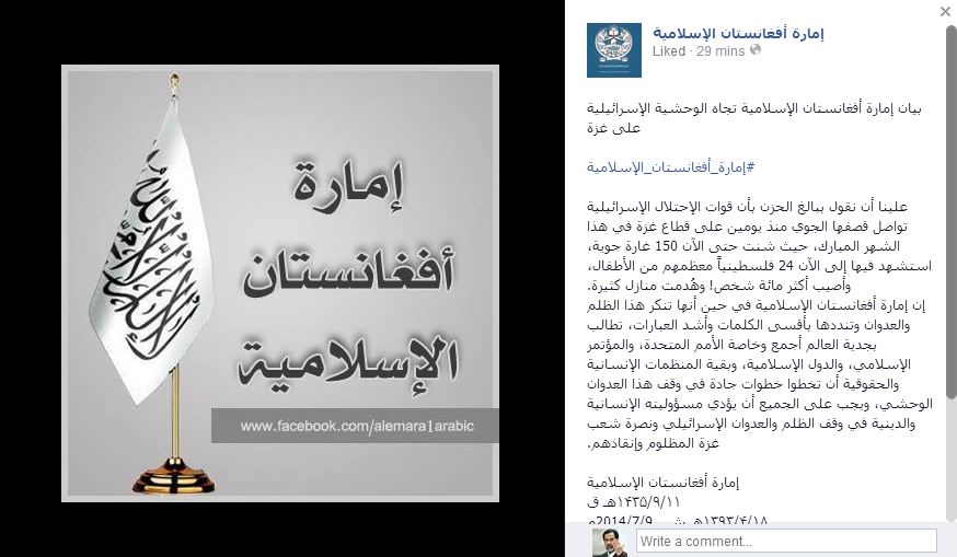 وأضافت:"إن فغانستان في حين أنها تنكر هذا الظلم والعدوان وتنددها بأقسى الكلمات وأشد العبارات، تطالب بجدية العالم أجمع وخاصة الأمم المتحدة، والمؤتمر الإسلامي، والدول الإسلامية، وبقية المنظمات الإنسانية والحقوقية أن تخطوا خطوات جادة في وقف هذا العدوان الوحشي، ويجب على الجميع أن يؤدي مسؤوليته الإنسانية والدينية في وقف الظلم والعدوان الإسرائيلي ونصرة شعب غزة المظلوم وإنقاذهم".