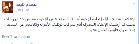 وقال تليمة فى تدوينة له عبر صفحته على "فيس بوك": "الإعلام المصري نازل إشادة لهجوم أشرف السعد على الإخوان مفيش حد ابن حلال يجيب لنا أرشيف الإعلام المصري أيام شركات توظيف الأموال وكلامهم عن السعد وأنه سرق فلوس الناس وهرب!!".