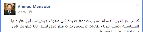 وقال فى تدوينة عبر صفحته على "فيس بوك": "كتائب عز الدين القسام تسبب صدمة جديدة فى صفوف جيش إسرائيل وقيادتها السياسية وتسير بنجاح طائرات تجسس بدون طيار تصل لعمق 60 كيلو متر فى سماء فلسطين المحتلة" .