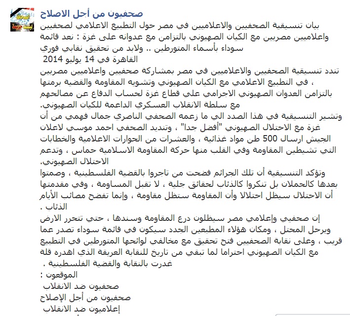 نددت تنسيقية الصحفيين والإعلاميين في مصر بمشاركة صحفيين وإعلاميين مصريين ، في التطبيع الإعلامي مع الكيان الصهيوني وتشويه المقاومة والقضية برمتها بالتزامن العدوان الصهيوني الاجرامي علي قطاع غزة لحساب الدفاع عن مصالحهم مع سلطة الانقلاب العسكري الداعمة للكيان الصهيوني.