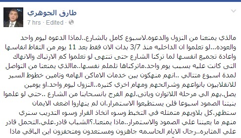 وقال الجوهرى فى تدوينة عبر صفحته على "فيس بوك" : ما لذي يمنعنا من النزول والدعوة.لأسبوع كامل بالشارع..لماذا الدعوة ليوم واحد والعودة…لو تعلموا أن الداخلية منذ 3/7 بدأت الآن فقط بعد 11 يوم من التقاط أنفاسها وإعادة تجميع أنفسها لما تركنا الشارع حتى تنتهى".