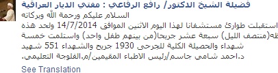 كشف الشيخ رافع الرفاعى مفتى العراق عن سقوط 551 شهيدا و1930 جريحا جراء القصف جيش المالكى لمدينة الفلوجة.