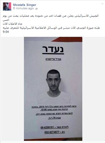 وقال الكاتب المتخصص في الشأن الاسرائيلي "مصطفى سنجر"، عبر حسابه على فيس بوك، اليوم الثلاثاء، إن "الجيش الإسرائيلي يعلن عن فقدان أحد من جنوده بعد عمليات بحث من يوم امس .. جاء الإعلان الآن .. هذه صورة الجندي الآن تنشر في الوسائل الإعلامية الاسرائيلية للتعرف عليه".