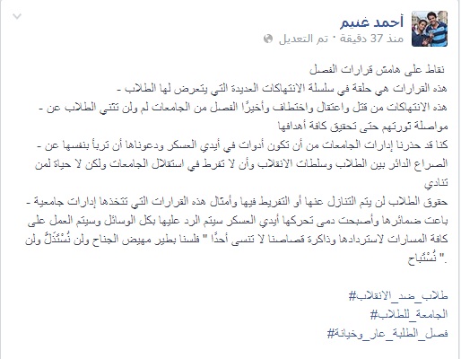 وأضاف غنيم فى تدوينة عبر صفحته الرسمية على "فيس بوك": كنا قد حذرنا إدارات الجامعات من أن تكون أدوات في أيدي العسكر ودعوناها أن تربأ بنفسها عن الصراع الدائر بين الطلاب وسلطات الانقلاب وأن لا تفرط في استقلال الجامعات ولكن لا حياة لمن تنادي.