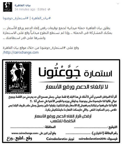 وكان "بيان القاهرة" قد أطلق حملة ميدانية أمس الأحد لجمع توقيعات رفض إلغاء الدعم ورفع الأسعار، من خلال طرح "استمارة جوعتونا".