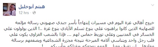 وأضاف أبو خليل فى تدونة عبر صفحته على موقع التواصل الاجتماعي "فيس بوك":"الذين يولولون علي الخسائر في المدنيين وعلي توريط حماس لهم، فإذا بالشعب الغزاوي يكون علي قلب رجل واحد ويتناسي آلامه المبرحة نتيجة مجزرة الشجاعية ويصفعهم برسالة مفادها …لن تفرق معنا …المهم نوجعكم ونقتلكم ونأسركم ".