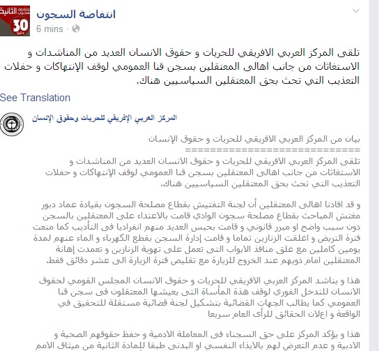 وقال المركز: تلقى المركز العربي الإفريقي للحريات و حقوق الإنسان العديد من المناشدات و الاستغاثات من جانب أهالى المعتقلين بسجن قنا العمومي لوقف الانتهاكات و حفلات التعذيب التي تحث بحق المعتقلين السياسيين هناك.