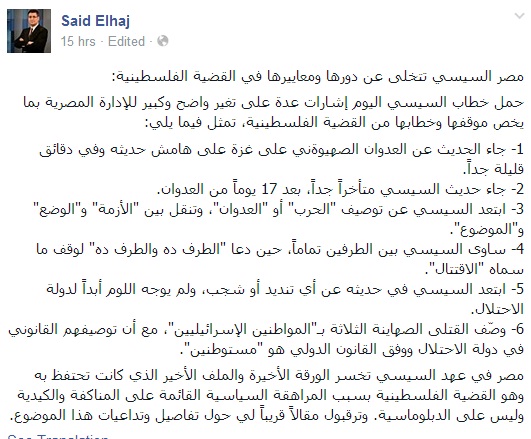 الحاج: مصر السيسي تخلت عن دورها في القضية الفلسطينية