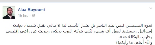 وأضاف بيومى، فى تدوينة عبر صفحته على "فيس بوك":"قدوة السيسي ليس عبد الناصر بل بشار الأسد، لذا لا يبالي بقتل شعبه، يهادن إسرائيل ومستعد لفعل أي شيء لكي يتركه الغرب يحكم، ويبحث عن راعي إقليمي يحارب بالوكالة عنه".
