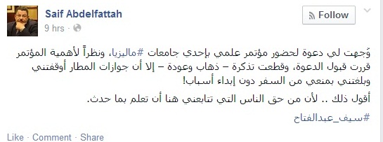وقال عبد الفتاح في تدوينة عبر صفحته على موقع التواصل الاجتماعي "فيس بوك": "وُجهت لي دعوة لحضور مؤتمر علمي بإحدى جامعات ماليزيا، ونظراً لأهمية المؤتمر قررت قبول الدعوة، وقطعت تذكرة – ذهاب وعودة – إلا أن جوازات المطار أوقفتني، وبلغتني بمنعي من السفر دون إبداء أسباب!".