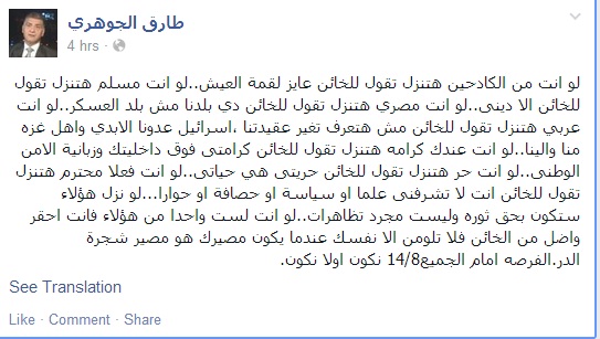 وقال الجوهرى في تدوينة عبر صفحته على موقع التواصل الاجتماعي "فيس بوك": "لو أنت من الكادحين هتنزل تقول للخائن عايز لقمة العيش..لو انت مسلم هتنزل تقول للخائن إلا ديني..لو انت مصري هتنزل تقول للخائن دي بلدنا مش بلد العسكر..لو انت عربي هتنزل تقول للخائن مش هتعرف تغير عقيدتنا، إسرائيل عدونا الأبدي وأهل غزة منا وإلينا".