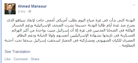 وأضاف منصور في تدوينة عبر صفحته على موقع التواصل الاجتماعي "فيس بوك": رغم الخسائر الهائلة في الضحايا المدنيين في غزة، إلا أن إسرائيل منيت بواحدة من أكبر الهزائم العسكرية في تاريخها بشهادة الإسرائيليين أنفسهم". وتابع: "لولا الخيانة ودعم النظام المصري للكيان الصهيوني، ومشاركته في الحصار لسحقت إسرائيل سحقا تحت أحذية المقاومة" .