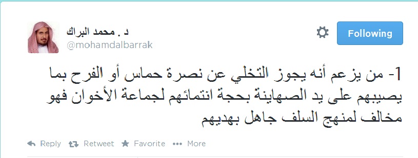 وقال خلال تغريدةٍ له نشرت عبر حسابه على موقع التواصل الاجتماعي "تويتر": "من يزعم أنه يجوز التخلي عن نصرة حماس، أو الفرح بما يصيبهم على يد الصهاينة، بحجة انتمائهم لجماعة الأخوان، فهو مخالف لمنهج السلف جاهل بهديهم".