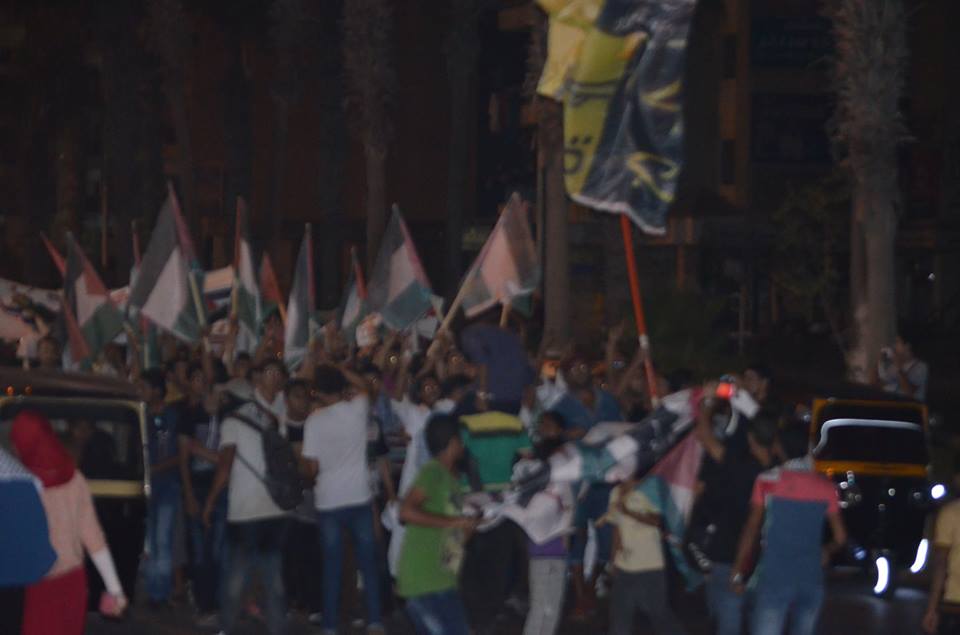 نظم أهالى "برج العرب" في محافظة "الأسكندرية"، تظاهرة تضامنية مع الشعب الفلسطيني وأهالي "غزة"، مساء أمس الثلاثاء، رفع المشاركون خلالها أعلام "فلسطين"، وشارات "رابعة"، وكذلك أعلام "الأولتراس".