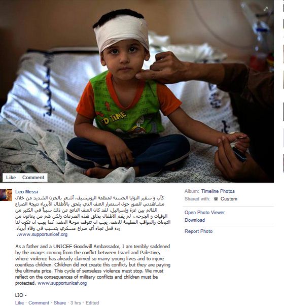 أعلن ليونيل ميسي نجم فريق برشلونة الإسباني عبر صفحته الرسمية علي موقع التواصل الاجتماعي "فيس بوك" رفضه للحرب التي تشنها إسرائيل على غزة وتضامنه مع الأطفال واعتبرهم المتضرر الأساسي من الحرب.