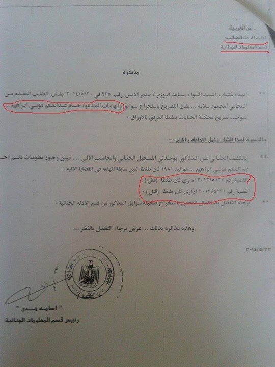 كما أن هذا الشخص هو نفسه المتهم الرئيسي في قتل الشهيدين حسام الدين عبد الرحيم و محمد عبد الله جاد كما هو مثبت في القضيتين (قتل 5127 لسنة 2013 إداري ثان طنطا ، قتل 5131 لسنة 2013 إداري ثان طنطا).