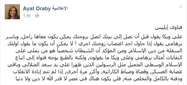 وقالت العرابي في تدوينة عبر صفحتها على موقع التواصل الاجتماعي "فيس بوك": "علي ويكا يقول قبل أن تصل إلى بيتك اتصل بزوجتك يمكن يكون معاها راجل، وياسر برهامي يقول إذا حاول احد اغتصاب زوجتك اجري ! لا يمكن أن يكون ما يقول أولئك السفلة من دين الإسلام".