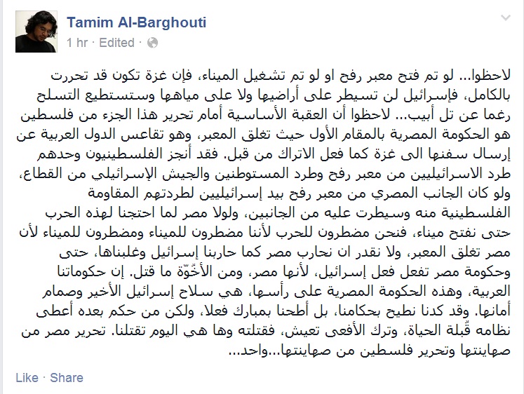 وقال البرغوثي في تدوينة عبر صفحته على موقع التواصل الاجتماعي "فيس بوك": "لو تم فتح معبر رفح أو لو تم تشغيل الميناء، فإن غزة تكون قد تحررت بالكامل، فإسرائيل لن تسيطر على أراضيها ولا على مياهها وستستطيع التسلح رغما عن تل أبيب".