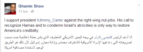 وقال غانم في تدوينة عبر صفحته على موقع التواصل الاجتماعي "فيس بوك": "أنا أدعم الرئيس جيمي كارتر في وجه اليمين الأمريكي المتطرف، الذي يشن حملة إعلامية ضده بسبب تصريحاته التي دعا فيها الإدارة الأمريكية للاعتراف بحماس وإدانة مجازر إسرائيل، لأن ذلك هو الطريق الوحيد لاستعادة مصداقية أمريكا".