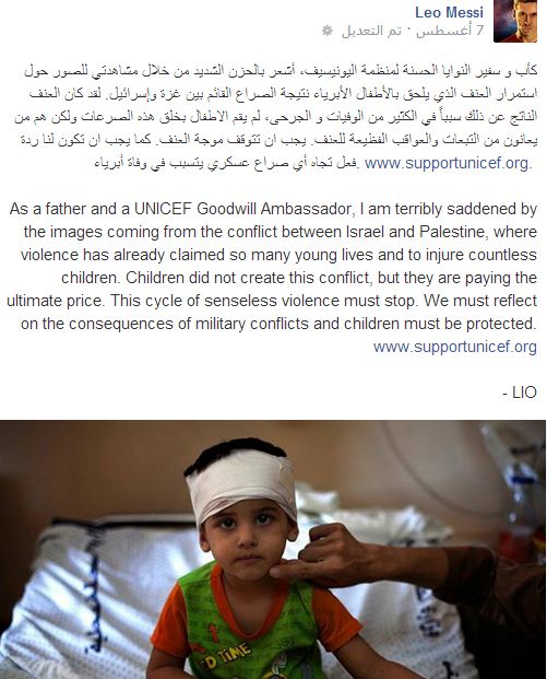 وقد نشر ميسي مع تعليقه على الفيسبوك صورة طفل فلسطيني مصاب في غزة من جراء العدوان الصهيوني.