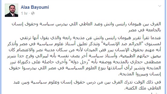 وقال بيومي في تدوينة عبر صفحته على موقع التواصل الاجتماعي "فيس بوك": "عندما تقرأ تقرير هيومان رايتس واتش عن مذبحة رابعة، والذي يقول أنها ترتقي لمستوى "الجرائم ضد الإنسانية"، وتتذكر تعليق أستاذ علوم سياسية في مصر وأتذكر أنه مهتم بحقوق الإنسان يبرر فض الميدان؛ لأنه من سكان مدينة نصر والاعتصام كان بيعيق حياتهم الطبيعية، وأستاذ سياسة أخر يصف نفسه بأنه ليبرالي وفرح جدا بتبرير مصطفى حجازي بالمذبحة، ووصفه بأنه "رجل دولة"، وأخرى حاصلة على دكتوراة تبرر المذبحة، وتشير لرأي أساتذتها بتوع العلوم السياسية في مصر اللي بيدرسوا حقوق إنسان ويبرروا المذبحة".