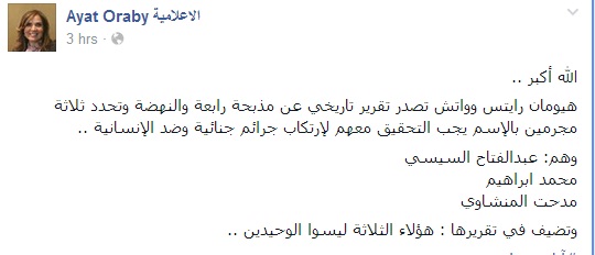 وقالت العرابي في تدوينة عبر صفحتها على موقع التواصل الاجتماعي "فيس بوك": "الله أكبر.. هيومان رايتس وواتش تصدر تقريرا تاريخيا عن مذبحة رابعة والنهضة، وتحدد ثلاثة مجرمين بالاسم يجب التحقيق معهم لارتكاب جرائم جنائية وضد الإنسانية، وهم: عبد الفتاح السيسي، محمد إبراهيم، مدحت المنشاوي، وتضيف في تقريرها: هؤلاء الثلاثة ليسوا الوحيدين".