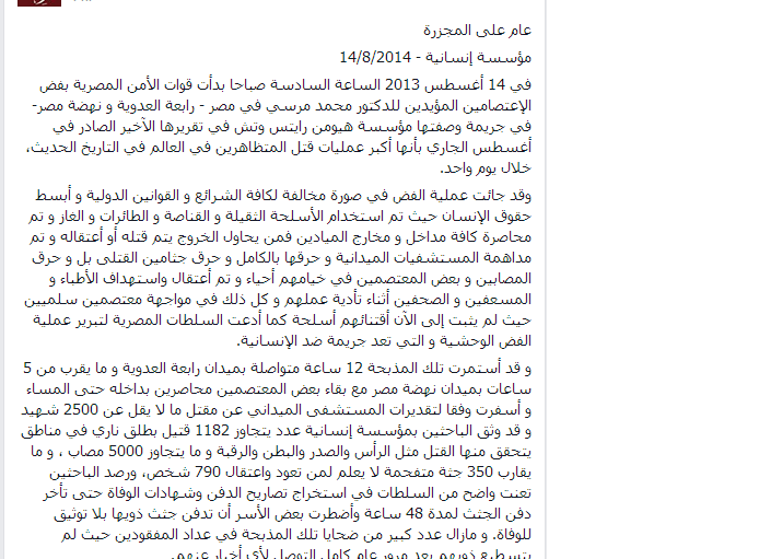 وقالت "في 14 أغسطس 2013 الساعة السادسة صباحا بدأت قوات الأمن المصرية بفض الإعتصامين المؤيدين للدكتور محمد مرسي في مصر – رابعة العدوية و نهضة مصر- في جريمة وصفتها مؤسسة هيومن رايتس وتش في تقريرها الأخير الصادر في أغسطس الجاري بأنها أكبر عمليات قتل المتظاهرين في العالم في التاريخ الحديث، خلال يوم واح".