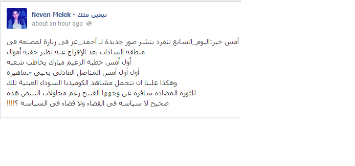 وأشارت ملك عبر صفحتها الشخصية على موقع التواصل الاجتماعي "فيس بوك" لمحاولات التبييض هذه أنها تمثلت في "أمس خبر: اليوم_السابع تنفرد بنشر صور جديدة لـ أحمد_عز في زيارة لمصنعه في منطقة السادات بعد الإفراج عنه نظير حفنة أموال"، مضيفة: "أول أمس خطبة الزعيم مبارك يخاطب شعبه"، و"أول أول أمس المناضل العادلى يحيي جماهيره".