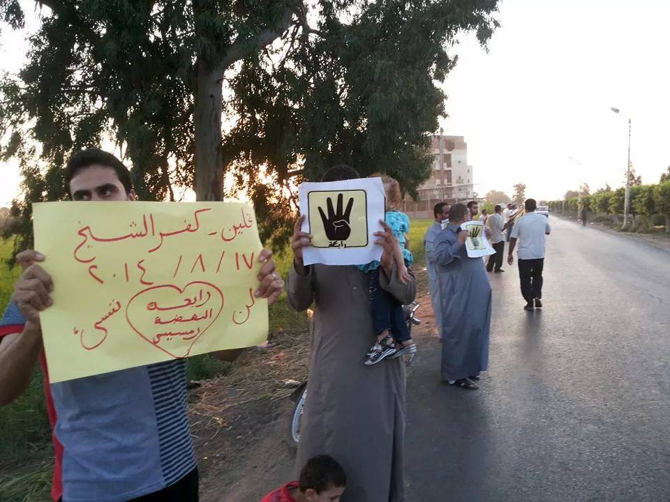 نظم رافضو الانقلاب بمركز "قلين"، في "كفر الشيخ"، سلسلة بشرية على طريق "كفرالشيخ – قلين"، حملوا خلالها شارات "رابعة"، وصورًا للمعتقليين مطالبين بالإفراج الفوري عنهم.