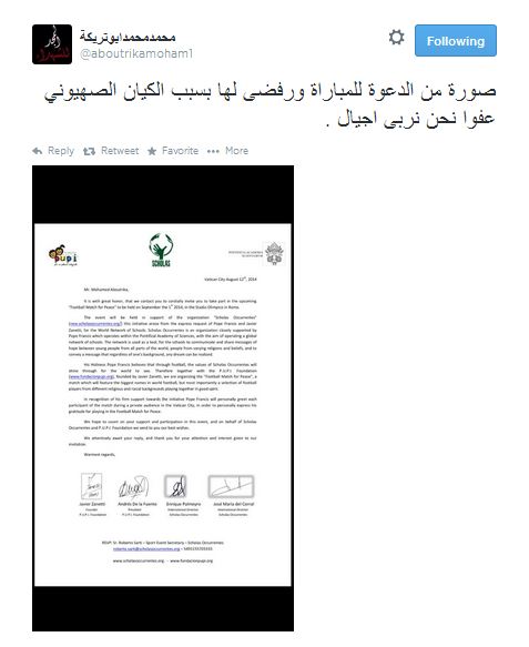أعلن الكابتن "محمد أبوتريكة"، بطل النادي الأهلي ومنتخب مصر السابق، رفضه دعوة تلقاها من بابا الفاتيكان "فرانسيس الأول" للمشاركة في مباراة ودية "من أجل السلام"؛ بسبب مشاكرة الكيان الصهيوني فيها. وقام "أبوتريكة" بنشر صورة من الدعوة المتلقاه من الفاتيكان على حسابه الشخصي على موقع التواصل الاجتماعي "تويتر".