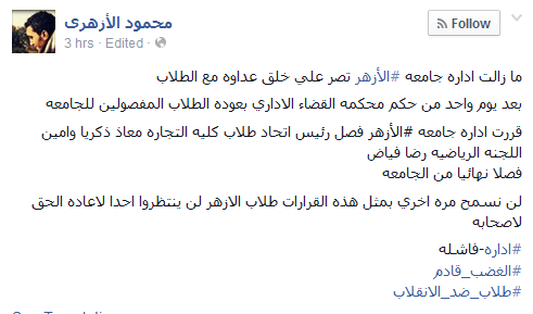 فعبر تدوينة كتبها على صفحته على موثع التواصل الاجتماعي "فيس بوك"، أشار "الأزهري" إلى أنه بعد يوم واحد من حكم القضاء الإداري لصالح قرابة الـ300 طالب مفصول من الجامعة، مابين فصل عام أو عامين، وفصل نهائي؛ قامت إدارة الجامعة بفصل رئيس اتحاد طلاب كلية التجارة "معاذ زكريا"، وكذلك أمين اللجنة الرياضية "رضا فياض"، فصلاً نهائياً.
