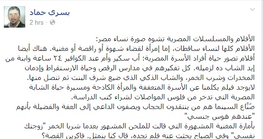 وأضاف حماد في تدوينة عبر صفحته على موقع التواصل الاجتماعي "فيس بوك": "هناك أيضا أفلام تصور حياة أفراد الأسرة المصرية؛ أب سكير، وأم عند الكوافير ٢٤ ساعة، وابنة من إيد الشاب ده لزميله، كل تفكيرهم في مدارس الرقص وحياة الارستقراط وإدمان المخدرات وشرب الخمر، والشاب الذكي الذي ضيع شرف البنت ثم تنصل منها".