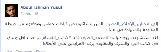 وقال يوسف في تدوينة عبر صفحته على موقع التواصل الاجتماعي "فيس بوك": "إلى خنازير الإعلام المصري الذين يتسائلون عن قيادات حماس وموقعهم من خريطة المقاومة والشهادة في غزة، لقد استشهدت زوجة وابنة محمد الضيف قائد كتائب القسام".