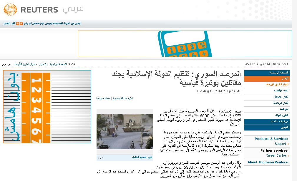 وبحسب التقرير، المنشور على "رويترز"، فإن ما يربو على 6000 مقاتل انضموا إلى تنظيم الدولة الإسلامية في "سوريا"، الشهر الماضي، في أسرع وتيرة لتوسع التنظيم إلى الآن، حسب ما قاله المرصد السوري لحقوق الإنسان، أمس الثلاثاء.