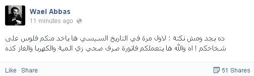 وقال عباس عبر حسابة الرسمي على فيس بوك:"ده بجد ومش نكتة : لاول مرة في التاريخ السيسي ها ياخد منكم فلوس على دخولكم الحمام ! اه والله ها يتعملكم فاتورة صرف صحي زي المية والكهربا والغاز كده".