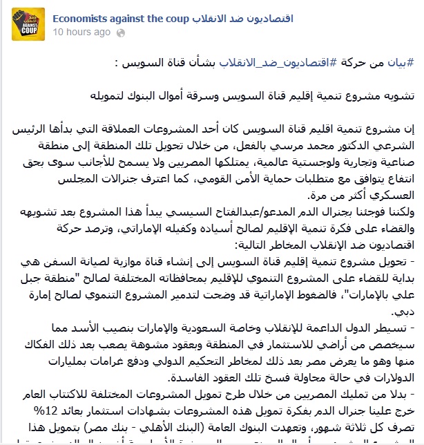 حذرت حركة اقتصاديون ضد الانقلاب من "تحويل مشروع تنمية إقليم قناة السويس إلى إنشاء قناة موازية لصيانة السفن هي بداية للقضاء على المشروع التنموي للإقليم بمحافظاته المختلفة لصالح "منطقة جبل علي بالإمارات"، فالضغوط الإماراتية قد وضحت لتدمير المشروع التنموي لصالح إمارة دبي".