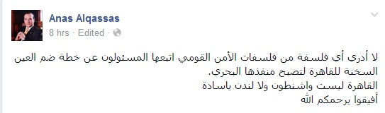 وقال القصاص في تدوينة عبر صفحته على موقع التواصل الاجتماعي "فيس بوك": "لا أدري أي فلسفة من فلسفات الأمن القومي اتبعها المسئولون عن خطة ضم العين السخنة للقاهرة لتصبح منفذها البحري".