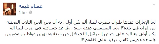 وقال تليمة فى تدوينة عبر صفحته على "فيس بوك": لما الإمارات عندها طيران بيضرب ليبيا، ألم يكن أولى به أن يحرر الجزر الثلاث المحتلة من إيران في بلده؟! ولما السيسي عنده جيش وقواعد بتساهم في ضرب ليبيا ألم يكن أولى به الرد على جيش إسرائيل الذي قتل من سنة وشهرين مواطنين مصريين ولسعه وجيش كامب ديفيد على قفاهم؟!!".