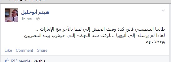 وقال أبو خليل فى تدوينة عبر صفحته على موقع التواصل الاجتماعي "فيس بوك ": "طالما السيسي فالح كده وبعت الجيش إلي ليبيا بالأجر مع الإمارات .. لماذا لم يرسله إلي أثيوبيا …لوقف سد النهضة اللي حيخرب بيت المصريين ويعطشهم".