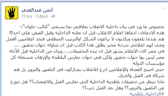 وقال عبد الغنى فى تدوينة عبر صفحته على "فيس بوك": هذه الادعاءات ادعاها إعلام الانقلاب قبل أن تعلنه الداخلية وقبل القبض علي احد!!!".