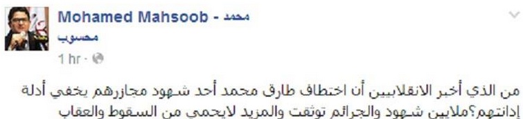 وتساءل محسوب فى تدوينة عبر صفحته على "فيس بوك": من الذي أخبر الانقلابيين أن اختطاف محمد طارق أحد شهود مجازرهم يخفي أدلة إدانتهم؟.