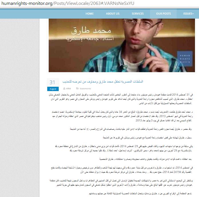 وذكرت المنظمة في بيان لها، مساء الأحد، أنه "في 31 أغسطس 2014 قدمت منظمة هيومان رايتس مونيتور نداءً عاجلًا إلى المقرر الخاص للأمم المتحدة المعني بالتعذيب، والفريق العامل المعني بالاحتجاز التعسفي بشأن اعتقال د. محمد طارق، الذي أصيب أثناء فض مجزرة رابعة العدوية والذي كان أيضا شاهد على تقرير هيومان رايتس ووتش على المجازر في مصر وهو التقرير التي أدان السلطات المصرية وحملها المسؤولية عن قتل الآلاف من الناس. "